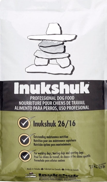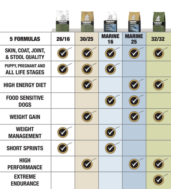 For example, Inukshuk 32/32 would make up a ratio of 32% protein and 32% fat. Each step up is higher in protein and in fat level. The formulas correspond to the increasing needs of dogs as they work harder.